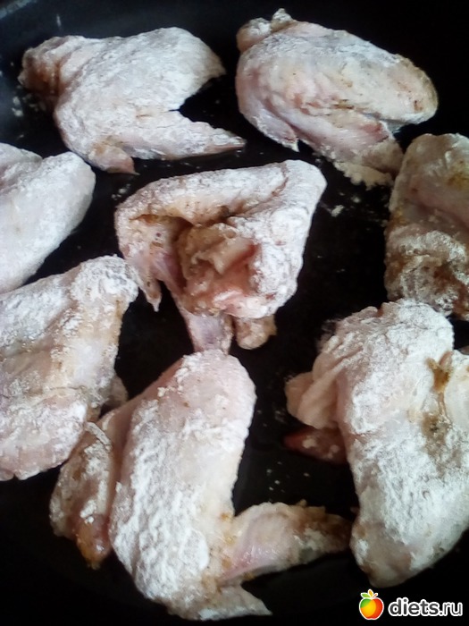 В отдельную тарелку насыпаем мукУ.. И аккуратно, каждый кусочек, ладошкой присыпаем мукой со всех сторон.(Как-бы- похлопывая). Если просто обвалять-то получается большой слой муки на курице и она станет мокрой.