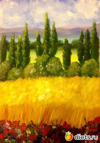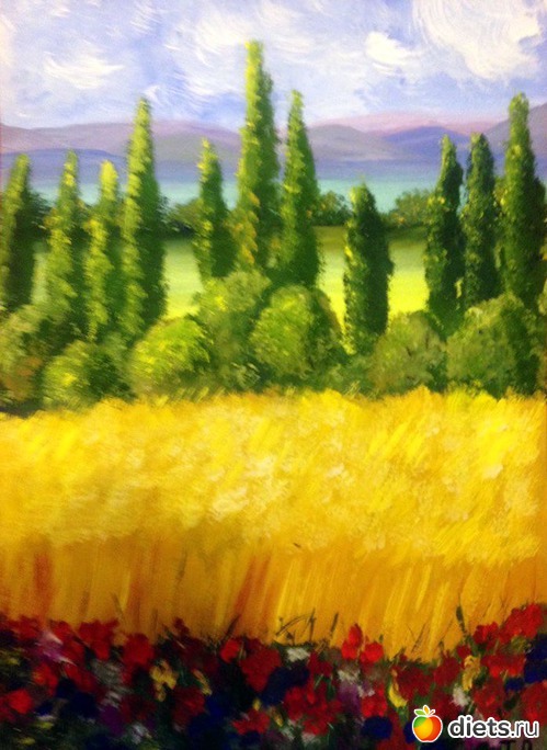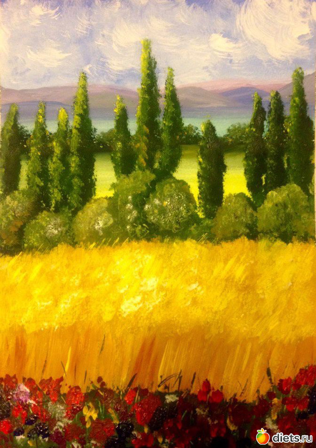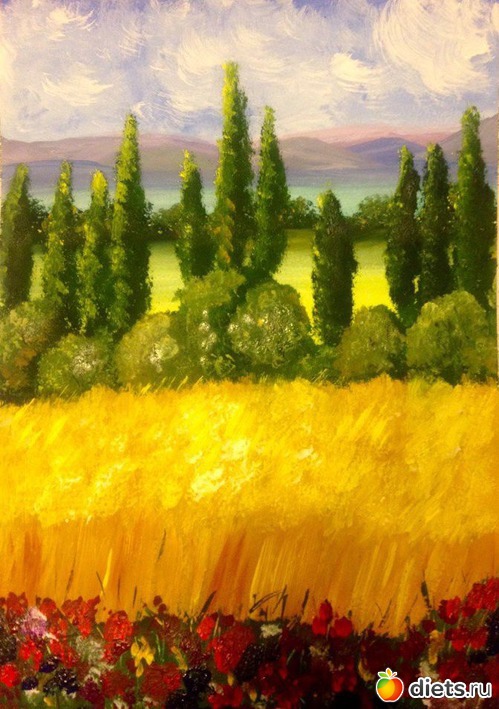 Вечером попала на он-лайн мастер-класс Наталии Йорк. Первый раз рисовала гуашью пейзаж по сюжету Г. Несвадба. Вот, что получилось: