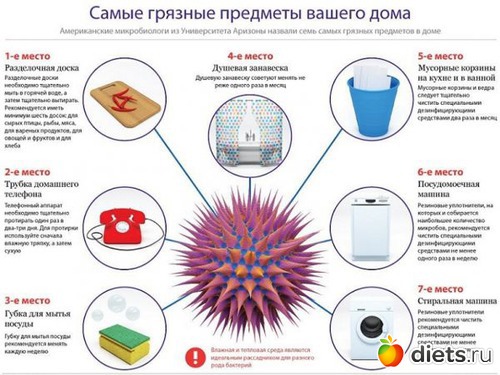 6. Посудомоечная машина, не смотря на то, что постоянно промывается водой и моющими средствами, все время заражена микробами. Они скапливаются на резиновых уплотнителях и переходят на посуду, из которой Вы едите. Пару раз в неделю пройдитесь тряпкой, смоченной в дезинфицирующем растворе внутри посудомойки.