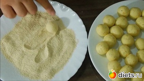 Приготовьте гладкое мягкое тесто. Скатайте небольшие шарики из сырного теста. Обваляйте их в панировочных сухарях и уберите на 30 минут в холодильник. Раскалите масло в сковородке и обжарьте шарики до золотистого цвета. Обсушите на бумажном полотенце. Подавайте к столу. Готовые сырные шарики можно обмакивать в кетчуп, горчицу или другой соус на ваш вкус.