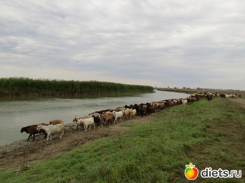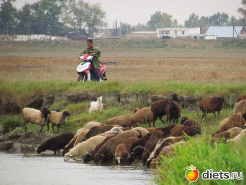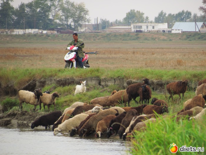 На мацацыкле-пастух. Зачем ему кричать, когда у его автомобиля есть сигнал? Стадо его понимает. Ещё с ним была собачка. Очень умная и сбивала баранов в стадо. Сама.