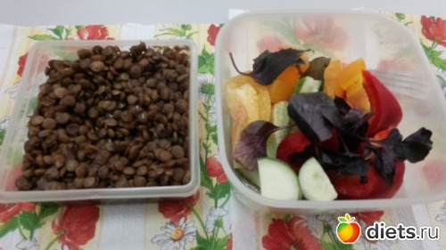 На обед чечевица с овощами свежими(базилик,помидор,огурец,перец)