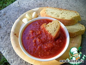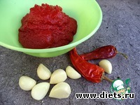 Чеснок и острый перец берём по вкусу, я на половину порции взяла 7 зубочков чеснока и два перчика. Перчик у меня был только сушёный, я его вместе с семенами добавила в блендер к болгарскому перцу, он дал великолепную остринк