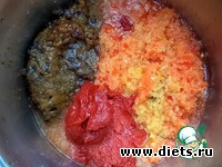 Сложить в кастрюлю все наши ингредиенты, добавить томатную пасту, сахар и соль. Варить на небольшом огне 30 минут, помешивая иногда. Если будете делать на зиму, в конце варки добавьте 1 ч. л. уксуса. Переложить в горячие сухие банки, перевернуть и оставить до остывания