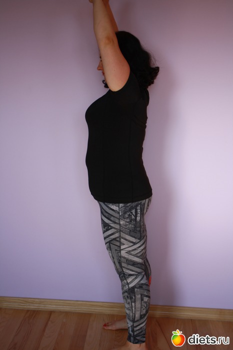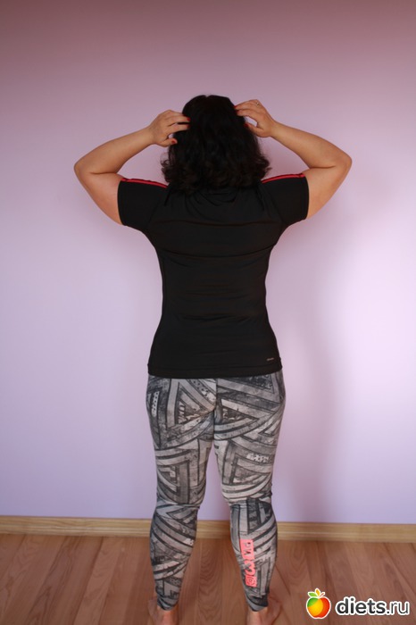 Специально нашла фото в этих же спортивных лосинах и спортивной футболке, но снятые через три недели после старта проекта. Хоть и плохо видно на фото с телефона, но если присмотреться – увидите и валики на спине, и бесформенные ягодицы.