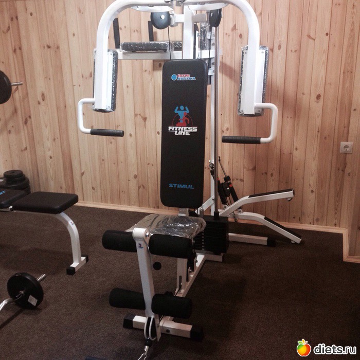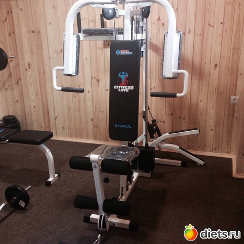 Фитнесс-станция - можно делать жим от груди, батерфляй, сгибание-разгибание ног, тяга вертикального и горизонтального блока, пресс в висе, степпер - огромные возможности) вес отягощение - 60 кг, но тросики выдерживают до 200 кг (потому если надо больше, можно ещё гантели наборные добавлять к весу отягощения):