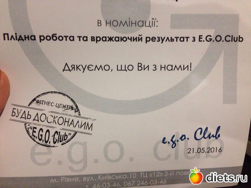 Ещё вспомнила: в зале, который я посещала 2,5 года, мне дали грамоту в номинации "Плодотворная работа и потрясающий результат". Местное телевидение брало интервью один раз - показывали в новостях пару раз.