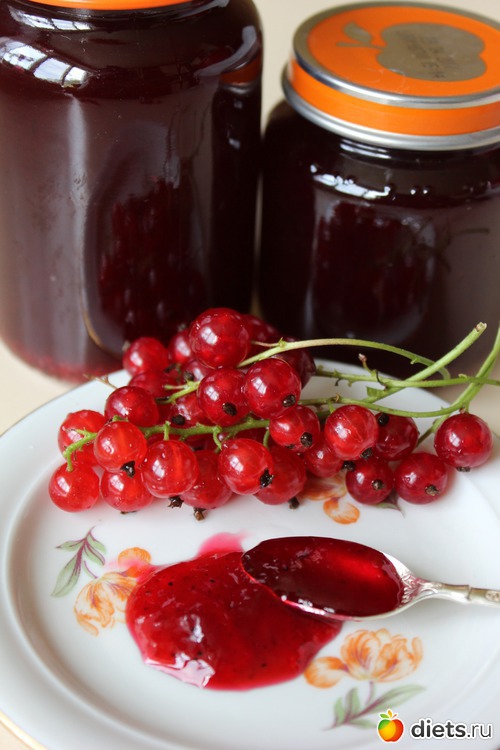 Смородину протираем через дуршлаг, отжимаем через марлю сок и жмыхи. Смешиваем. Ставим на огонь, как только начинает булькать - убавляем до минимума. Кипеть не должно, иначе - прощайте, пектины, а вместе с ними - надежды на желе в результате. Сахар сыплем порциями, по стакану, с интервалом в минут пять-семь. После последней загрузки сахара добавляем специи и уксус. Варим еще пять минут и грузим в стерилизованные баночки.