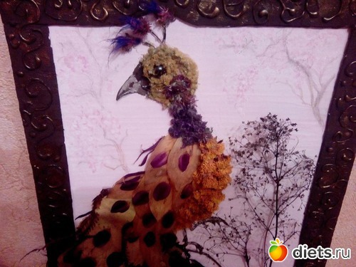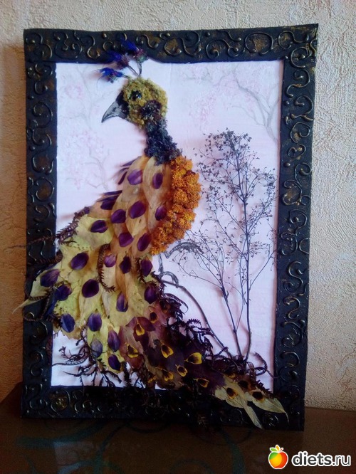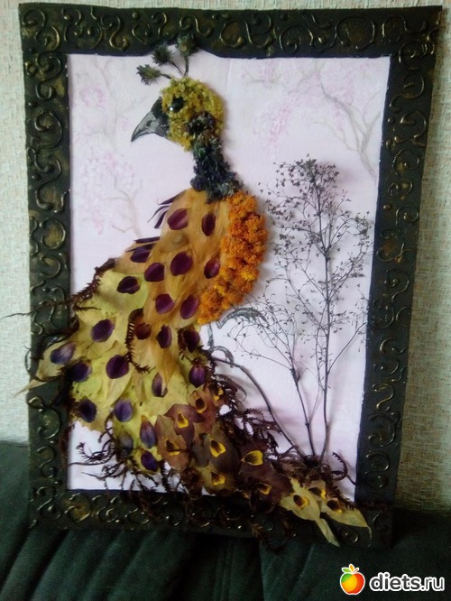 И последняя из семейства пернатых - Жар-птица из осенних листьев и цветочных лепестков. Основа - картон, рамочка тоже из картона: