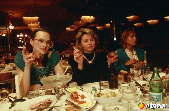 «Арагви» славился своими шашлыками, ресторан при Центральном доме Литераторов – богатой винной картой, а «Узбекистан» – восточной кухней. Но в целом выбор у женщин был небольшим. Поэтому посетительницы не стеснялись заказывать фирменные и все необычные блюда, которые находили в меню. Диеты и необходимость следить за фигурой временно отходили на второй план. Любимыми напитками были вина и вермуты.