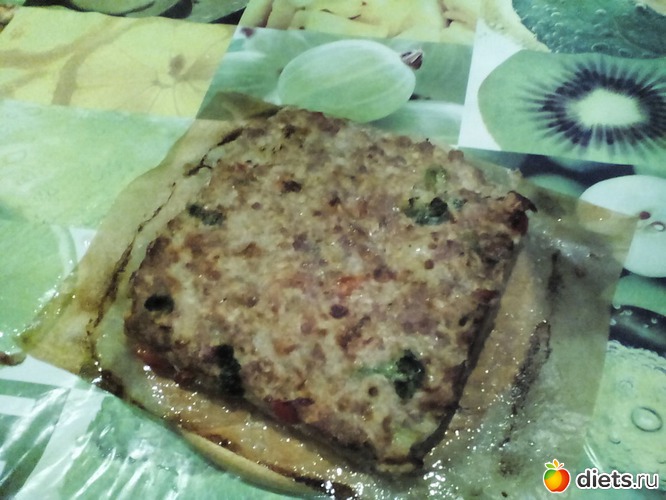 Для любителей готовить быстро, относительно диетично и вкусно. Берем филе куриного бедра грамм 800-900, срезаем лишний жир и крутим на мясорубке. Брокколи и цветную капусту использую мороженую грамм по 200, заливают кипятком, оставляю на пять минут, сливаю воду, добавляю соевый соус около 2чайных ложек, перемешиваю, оставляю постоять минут 5-10. В это время кубиками режем один крупный красный перец, в фарш добавляю соль и приправы по вкусу. Для меня это хмели-сунели, базилик и овощная приправа пять поваров, перемешиваю фарш, вмешивая в него брокколи, цветную капусту и перец. Весь замес выгружаю на противень на тефлоновый лист, что бы по причине природной лени не отшкрябывать стенки. Отправляю в духовку на 180 градусов на 40-45 минут. Потом прямо на листе разрезаю на куски тефлоновой лопаткой, остужаю и отправляю в холодильник. Очень удобно брать с собой на работу, можно не греть, в холодном виде тоже вкусно.