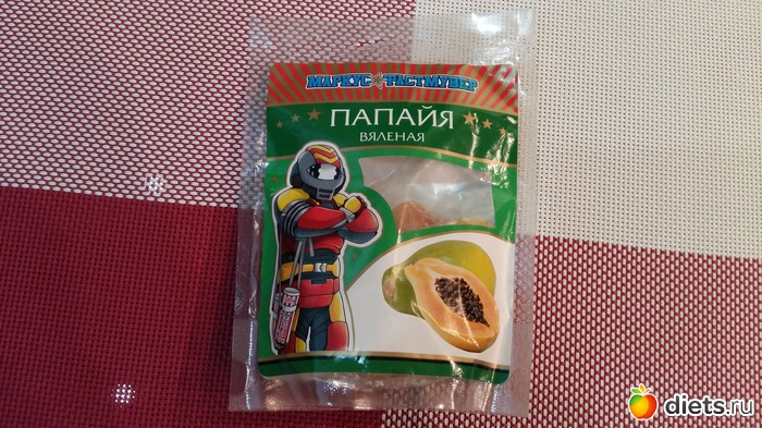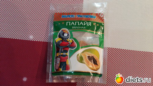 Самая дешевая вяленая папайя 157 рублей пакетик. Вот я ее и купила попробовать. Папайю в свежем виде мне не приходилось пробовать, поэтому кушала ее впервые.