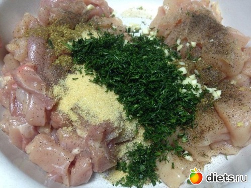 С куриных окорочков снять кожу, отделить мясо от костей и нарезать. Куриную грудку тоже нарезать и сложить в миску.