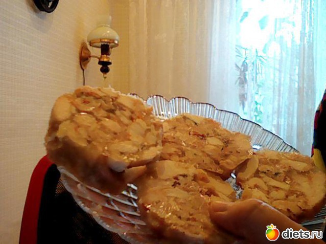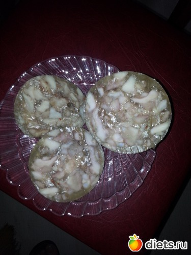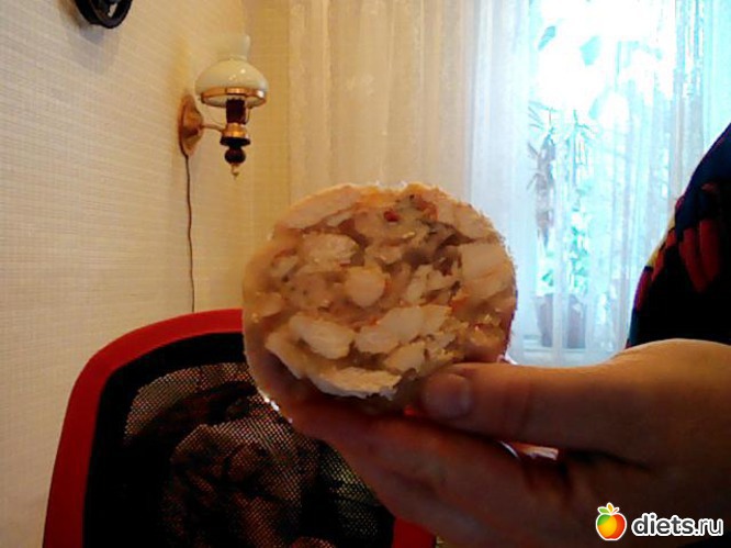 Затем охладить до теплого состояния и это все переложить в обрезанную пластиковую бутылку. Беру пластиковую бутылку, отрезаю от нее горлышко и перекладываю содержимое пакета. Сверху надо поставить небольшой груз, для того, чтобы мясо было полностью покрыто желе.(я ставлю стакан с водой) Ставим в холодильник до полного застывания. Затем разрезаем бутылку и достаем наш рулет.
