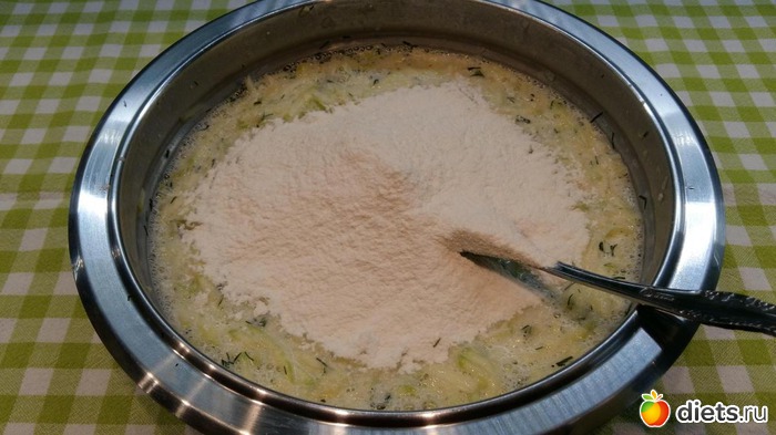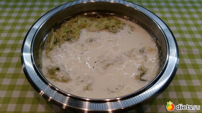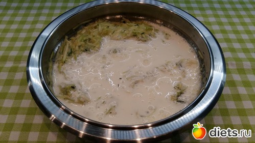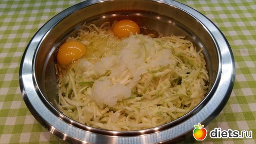 Кабачок с мягкой шкуркой, поэтому натираю на терке вместе с ней, не чищу. Так же натираю лук и добавляю парочку куриных яиц