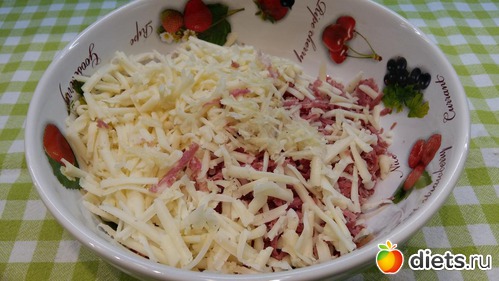 Теперь готовлю начинку, сегодня у меня натертая на терке варено-копченая колбаска и сыр, еще добавила зубчик чеснока. Начинка может быть любой на ваш вкус, обычный фарш с луком и зеленью, сыр с творогом, чесноком и зеленью и т. д.