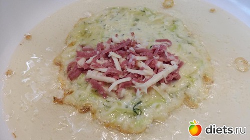 В сковороде разогреваю растительное масло без запаха. В разогретое масло выкладываю 2-3 столовые ложки кабачкового теста, на один край кладу начинку и как тесто чуть схватилось, накрываю начинку пустым краешком и немного прижимаю, чтобы наш чебурек, как бы склеился. На среднем огне с обеих сторон довожу до готовности, можно накрыть крышкой