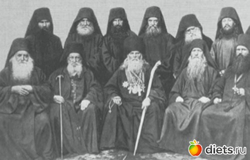 Часть братии и гости Русского монастыря (XIX в.) с духовником обители о. Иеронимом (сидит второй справа).