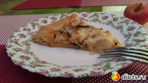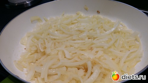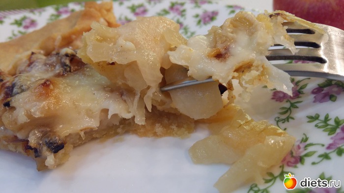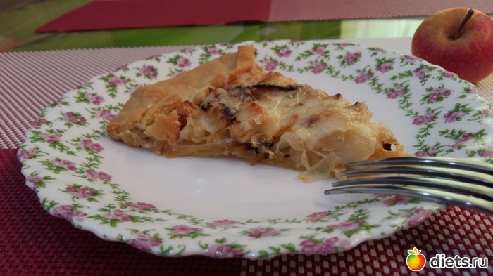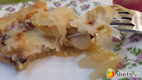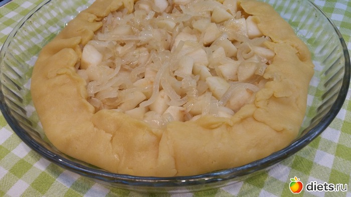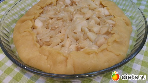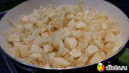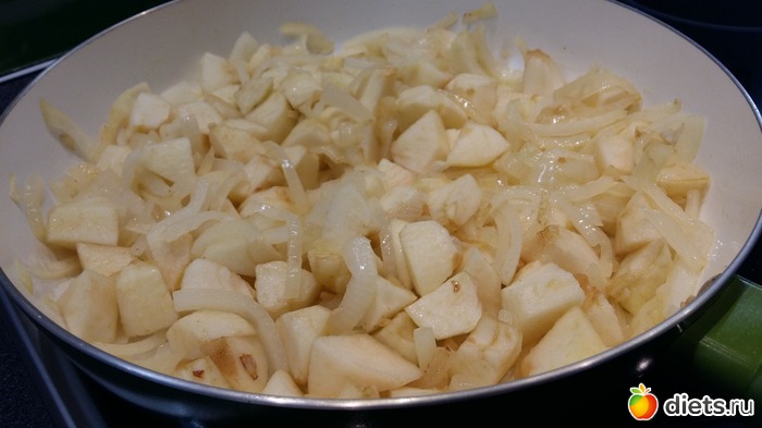 Пока лук немного подрумянится, чищу 2-3 яблока, можно и 4 взять, если не очень крупные. Яблоки беру те, какие есть в доме. Нарезанные яблоки добавляю к луку в сковородку и вместе держу на среднем огне не больше 5-10 минут. Начинка готова, оставляю в сторонке, чтобы остыла и готовлю тесто