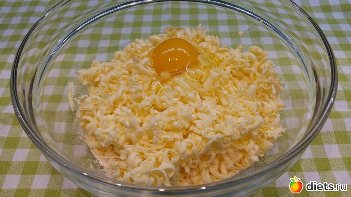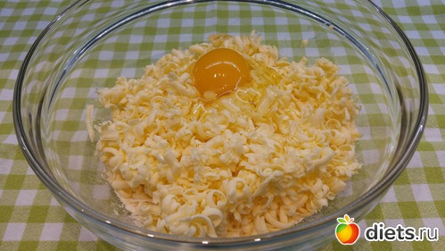 Так же к муке и сыру натираю 100 грамм замороженного масла и добавляю яйцо куриное, все смешиваю руками и собираю тесто в шар