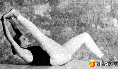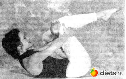 Оставайтесь тут же на полу, лежа на спине. Обе ноги согнуты в коленях, ступни поставлены на пол. Поднимите левую ногу и ухватитесь за нее обеими руками. Теперь вы настолько гибки, что можете взяться за ногу на уровне икры или даже щиколотки. Притяните ногу к туловищу как можно ближе.