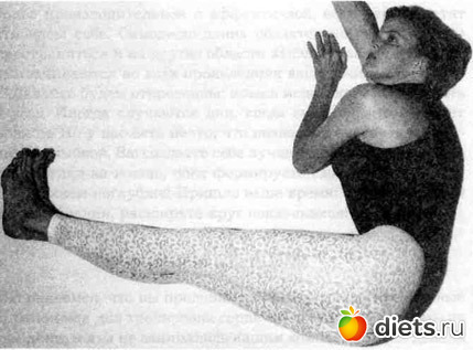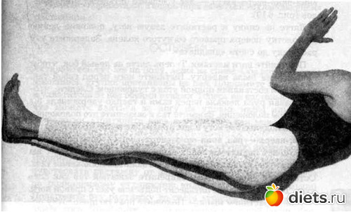 Поменяйте ноги местами. Теперь лягте на левый бок, чтобы правая нога была наверху. Вытяните ноги перед собой так, чтобы они составляли прямой угол с туловищем. Следите, чтобы правая рука лежала перед вами и твердо удерживала бы вас в этом положении. Зажмите таз и закрепите это положение. Теперь поднимайте ногу в два приема, не выше уровня бедра: вверх-вверх — раз, вниз-вниз-вверх-вверх — два. Если ваша нога может подняться вверх выше уровня бедра, значит вы недостаточно хорошо закрепились в зажатом положении таза. Остановите упражнения и закрепите зажатый таз как следует. Теперь сделайте пятьдесят подъемов уже с правой ноги.
