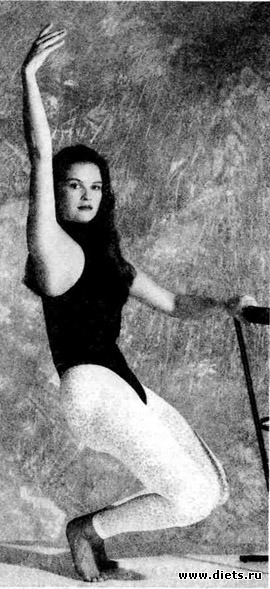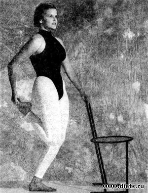 Встаньте у станка, развернув ноги пошире. Колени смотрят в стороны, нависая над ступнями. Согните колени на пять сантиметров. Поднимите левую пятку, оторвите ее от пола, а потом точно так же оторвите от пола правую пятку. Встаньте на носки как можно выше. Перенесите на пальцы вес тела. Это снимет напряжение с коленей и даст возможность разработать коленные сухожилия.