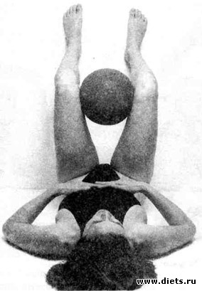 Зажмите мяч между коленями. Теперь зажмите таз и сожмите бедра, чтобы сжать мяч. Сожмите мяч дважды, потом зажмите таз, пока вы одновременно сжимаете мяч. Не поднимайте спину и не отрывайте ее от пола — только ягодицы поднимаются, пока вы сжимаете мяч. Ритм упражнения такой: бедра-бедра-таз. Считаем: раз. Потом снова: бедра-бедра-таз, считаем: два. Повторяйте это движение методично и ровно. Проделайте его тридцать раз, чтобы завершить цикл.
