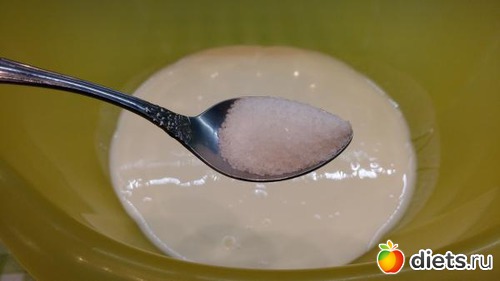 В миску наливаю 300-350 мл кефира и добавляю не полную чайную ложечку соли и щепотку сахара
