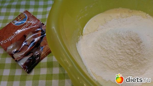 просеиваю 2-2,5 стакана муки с чайной ложкой разрыхлителя, муку лучше постепенно добавлять, тесто должно быть очень мягенькое