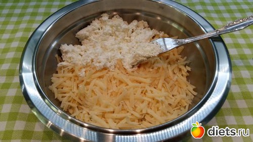 грамм 150 сыра натираю на терке и смешиваю с таким же количеством творога