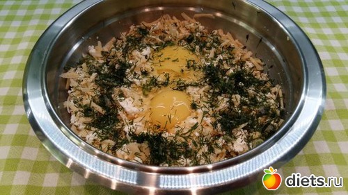 добавляю зелень по вкусу, пару яиц и зубчике чеснока через пресс (можно и больше), перемешиваю