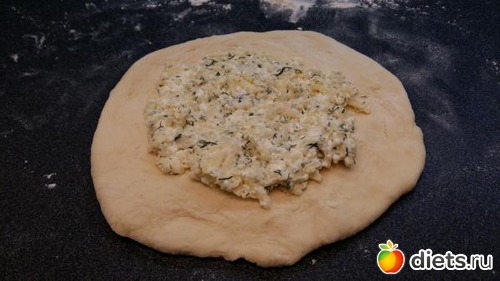 руками каждый кусочек расплющиваю в лепешку и выкладываю начинку