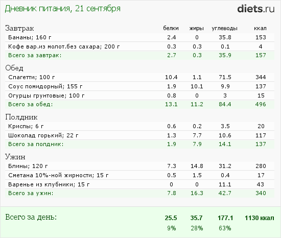 Вчера был углеводный - на обед спагетти с соусом, в 16-30 горький шоколад (22гр.) с крипсом, в 19-00 - 2 блинчика с ложкой варенья и сметаны (думаю этот вариант не хуже пироженного