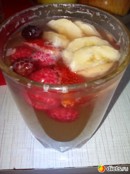 Разложите фрукты, ягоды по стаканам(креманкам, формочкам-на Ваше усмотрение). Я делала желе с ягодами с дачи(предварительно их не размораживать!) +банан.