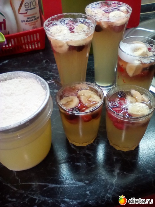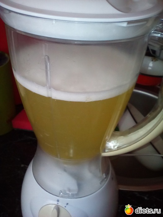 Разлейте сыворотку в стаканы с фруктами. Пенка потом осядет, не волнуйтесь!