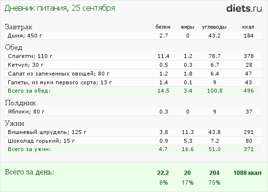 О. 13-00 Спагетти (сырых 110 гр.), кетчуп 30 гр. (содержал сахар, но готовить помидорный соус было лень), галеты 2 шт, салат с овощей 80 гр.