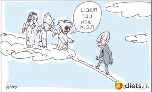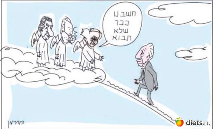На картинке Давид Бен-Гурион ( первый премьер), Голда Меир (5-й премьер-министр), Ицхак Рабин (6-й и 11-й премьер) встречают Шимона Переса с возгласом: " Думали, что ты уже не придёшь..."