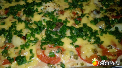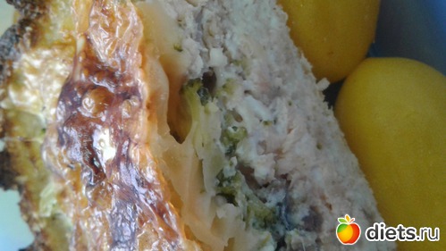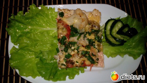 За это время отвариваем 100г брокколи. Нарезаем кусочками, натираем 40-50г сыра, смешиваем 1 яйцо+50мл молока. Готовим рыбу- последний раз я брала консерву натуральную горбуши . Чистый вес рыбы вышел 165г. До этого делала с скумбрией отварной. Еще раз делала с сардинелой в масле ( но тут жирность выходит побольше,ткт рыба в масле). Можно использовать консерву тунца. Вообщем рыба на ваш вкус в районе 150-170г. Рассчет у меня с горбушей. Итак, достали основу. Выложили на нее кусочки рыбы(поломать вилочкой), сверху брокколи, сверху натертый сыр, залили смесью яйца и молока и в духовку на 20-25 минут. Вкусняшка готова!