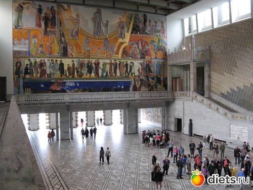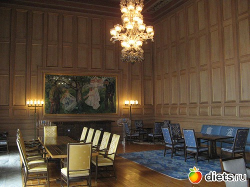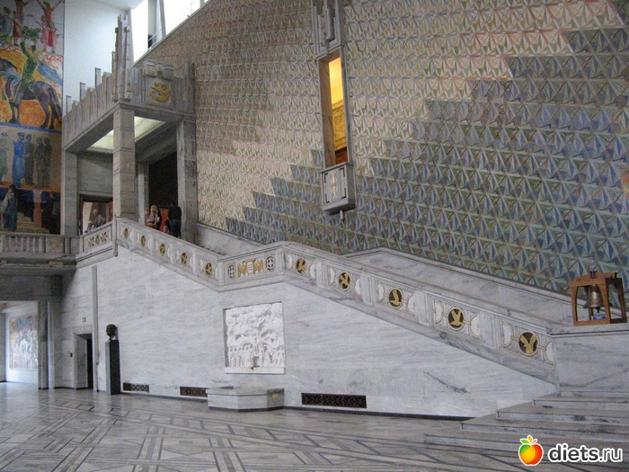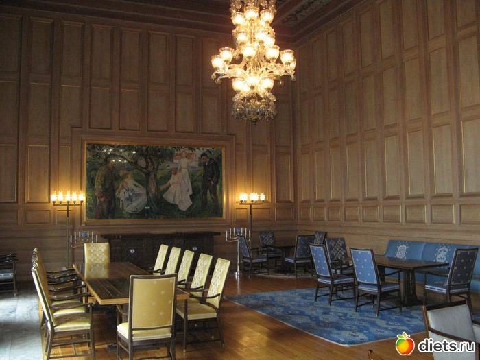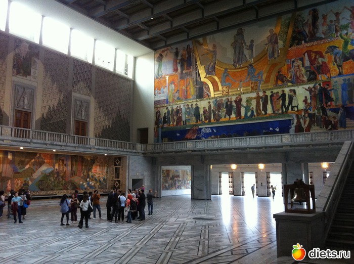 Вход бесплатный, внутри красиво, празднично так. Фрески на стенах, скульптуры персонажей скандинавской мифологии, предметы интерьера музейной ценности, вид из окна на Осло - фьорд...
