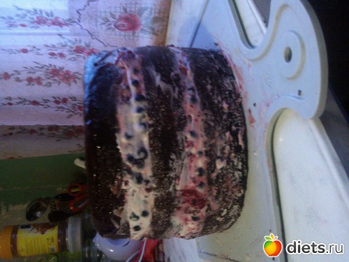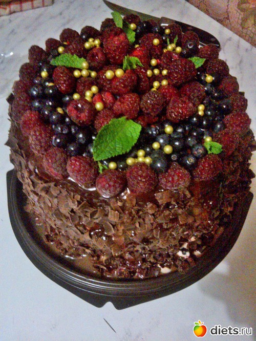 Тортик творила сутки или больше...Вообщем,в субботу вечером испекла бисквит"Шоколад на кипятке"(крутой,мой любимый) и ночь он отдыхал на решетке.Утром сбегала на рынок за ягодами.Венчики от миксера и посуда для сбивания с ночи лежали в морозилке(для сливок33%).Сами сливки 2 суток в холодильнике на 0 +2градусах.Сварила сироп,отцедила,пропитала.Занялась кремом.Намазала,собрала,обмазала весь сиропом,сварила глазурь ,облила,тертым шоколадом обсыпала,украсила и на ночную пропитку поставила.Около 23-00 опомнилась,что не в чем его,громадину,везти(90 км от Минска)До двенадцати ночи клеела коробку...Ох,намаялась,а на 4 утра (понедельника)стоял будильник