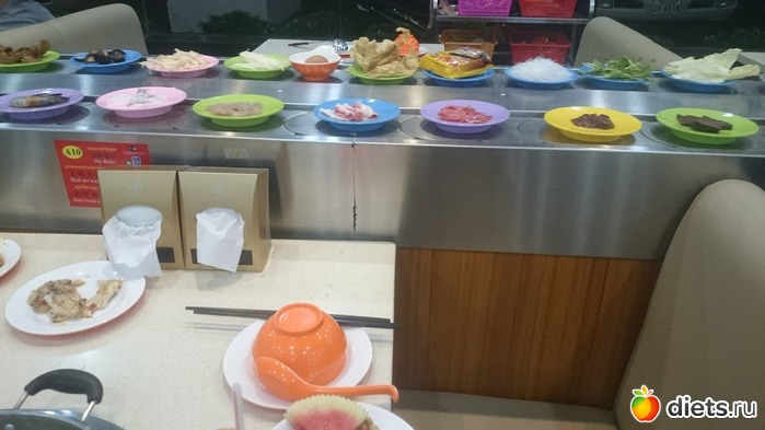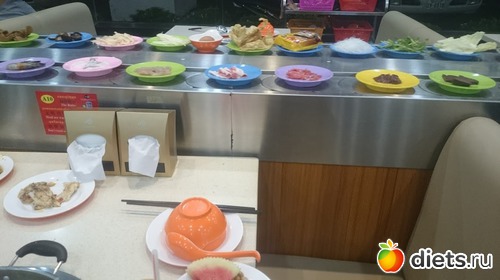 а рядом двигаются по большому конвейеру тарелки с мясом, морепродуктами, живыми крабами, зеленью, грибами, короче куча всего...