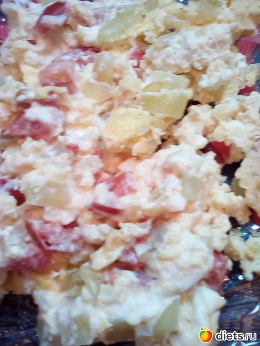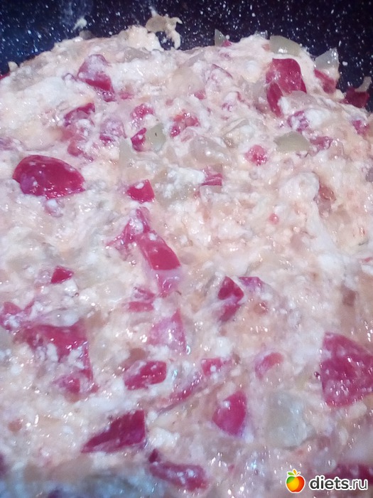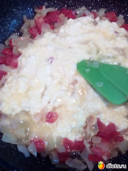 Яично-сырную смесь выливаем в сковороду и сразу же перемешиваем с овощами.