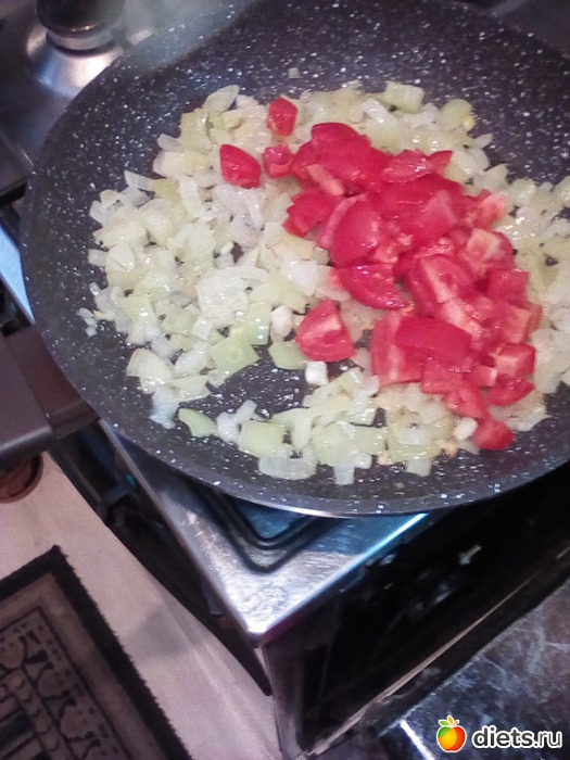 Когда перцы чуть размякнут - добавляем к ним мелко нарезанные томаты. Продолжаем тушить на среднем огне - еще минут 10