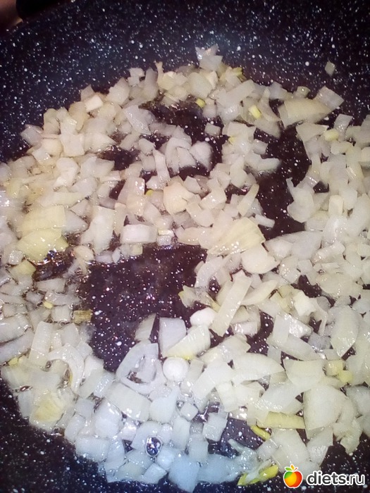 Репчатый лук мелко нарезаем и обжариваем в масле - недолго, буквально 1-2 минуты.