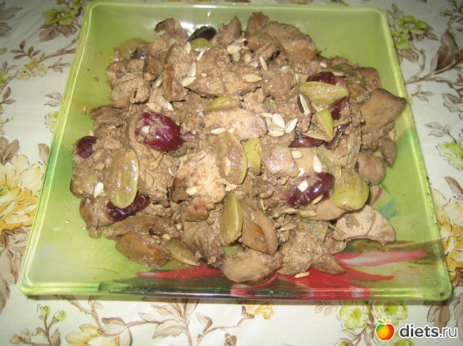 На тарелке смешала печень, виноград и посыпала эту вкуснятину обжареными кедровыми орешками, (привезенными нами же сестричке, дабы напомнить ей где она родилась