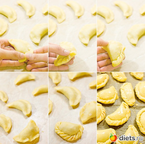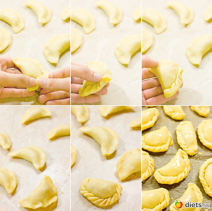13. Тесто с начинкой складываем пополам и защипываем края, при необходимости слегка смачивая их водой. В случае с таким тестом просто склеить его недостаточно — при выпечке оно разойдётся, выпуская начинку наружу. Поэтому, соединив края, мы запечатываем их, заворачивая на одну сторону, немного внахлёст. Получается декоративный бортик — это и красиво, и практично.