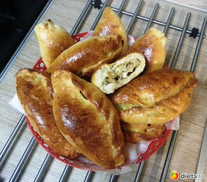 У меня начинка - тушеная капуста с луком и морковью + 3 вареных яйца.