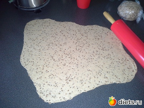 Замешиваем тесто-у меня это сделала хлебопечка на режиме пицца. Тесто получилось пластичным, и спокойно раскаталось на столешнице без муки. Раскатываем как можно тоньше.