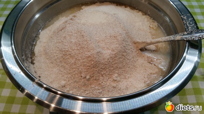 просеиваю около 400 грамм муки, я взяла пшеничную высшего сорта и пшеничную цельнозерновую